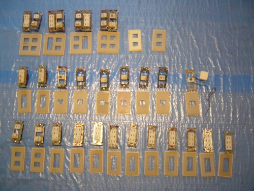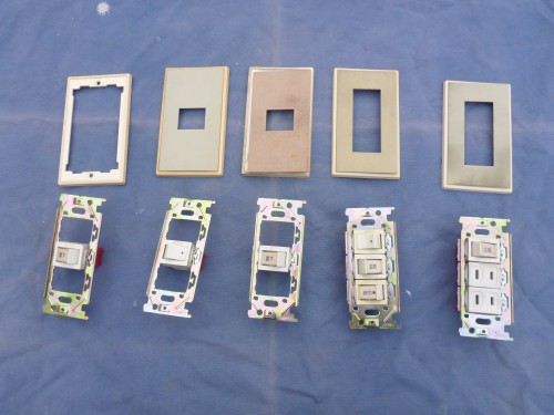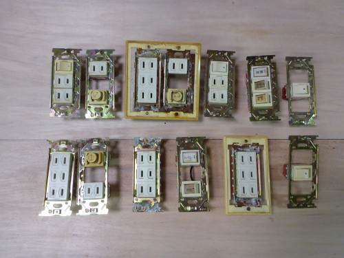 取り替えた旧品のコンセントとスイッチを、並べて見ました。