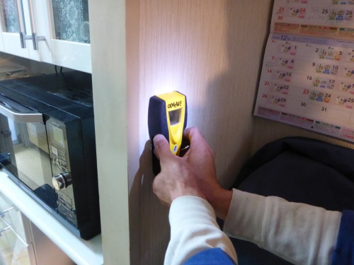 まずは、キッチン入り口の壁うらを、センサーでチェックをさせていただきます。