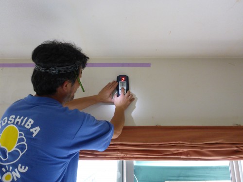 まずは、室内機据付板固定の為の 壁裏のセンサーチェックをいたします