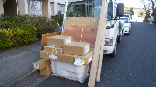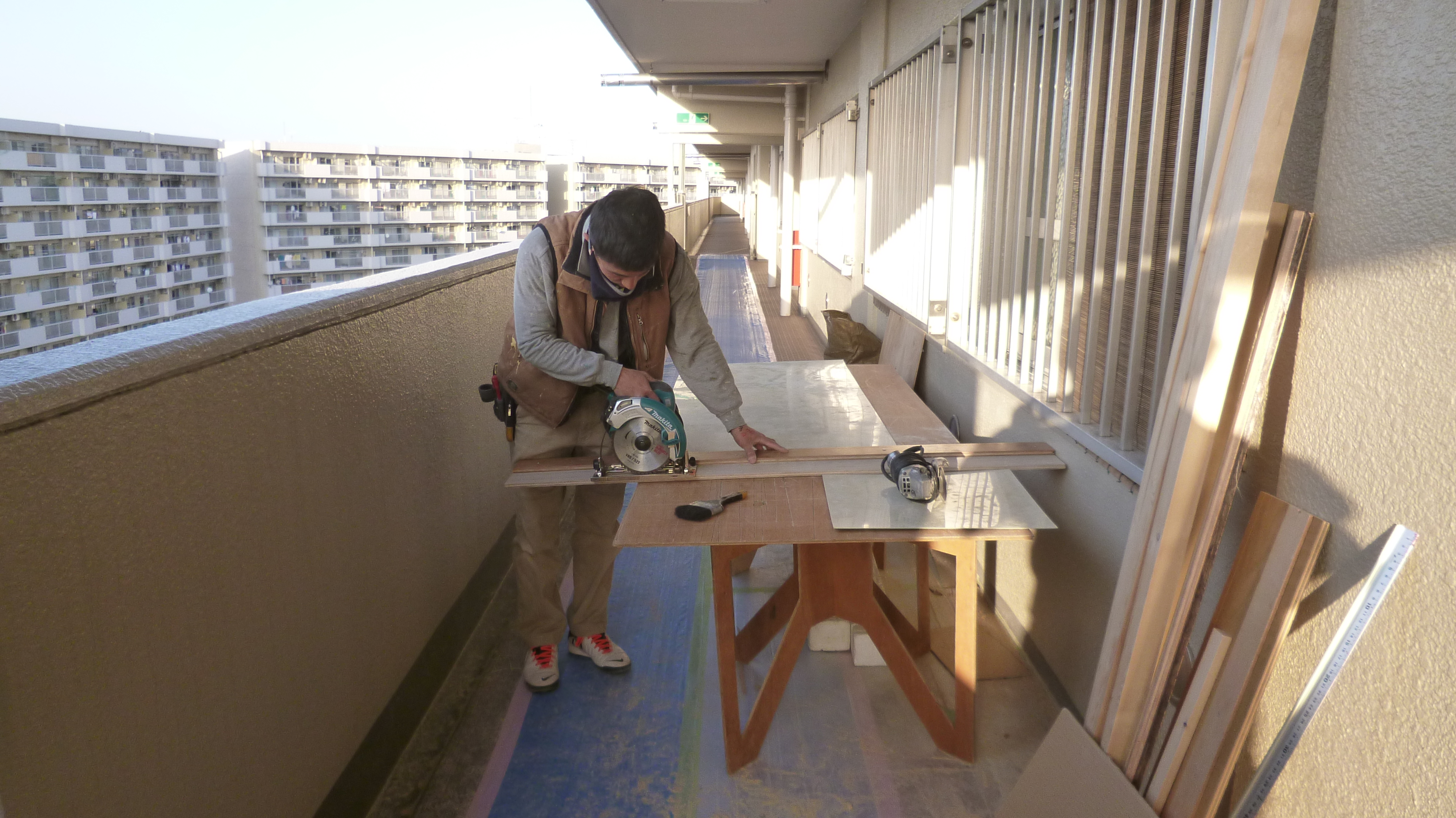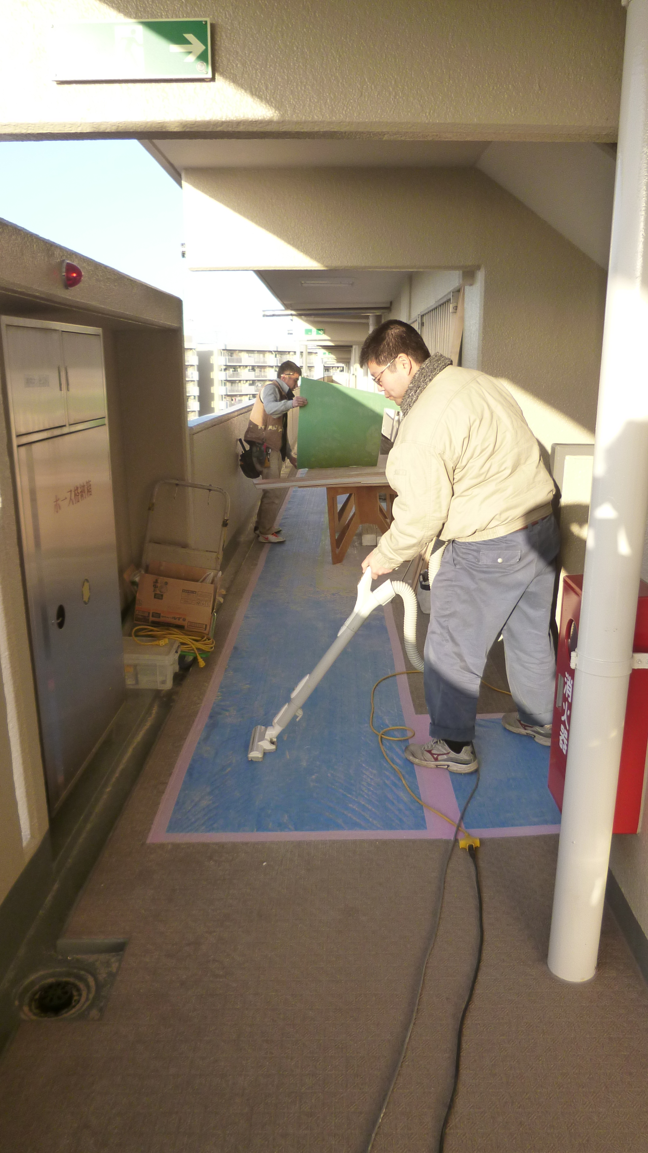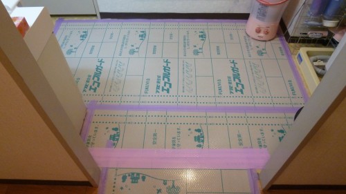 先ずはリビングをお借りして、床材の巻き癖を取ります。