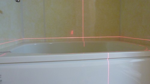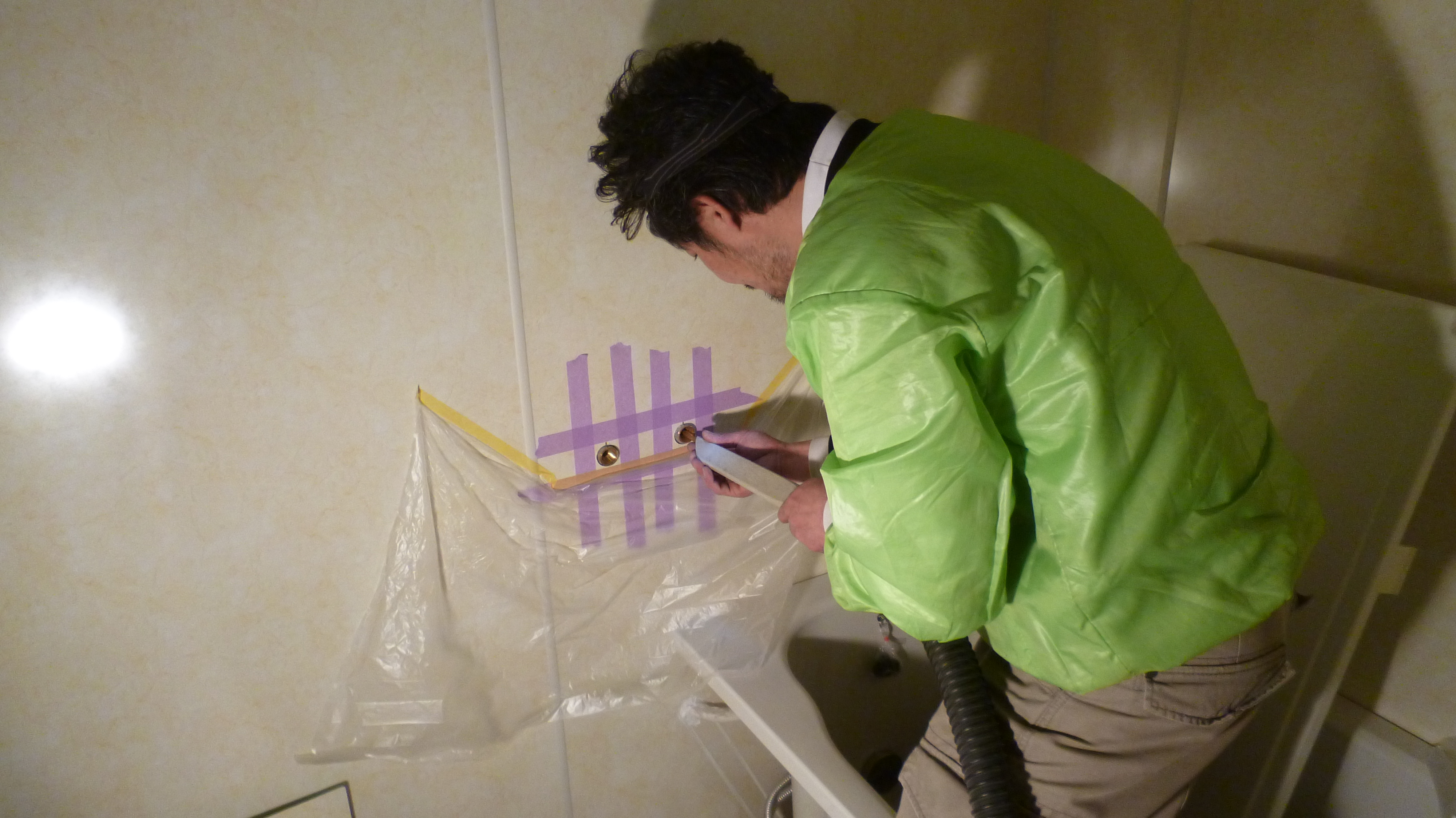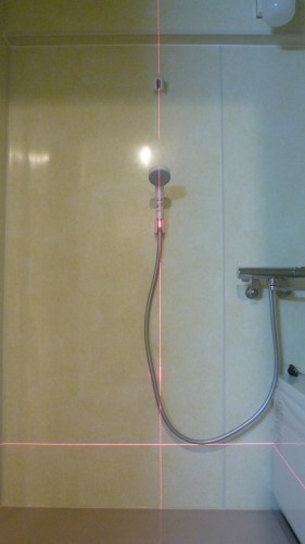 材料の巻き癖を取っている間に、浴室の寸法を取ります