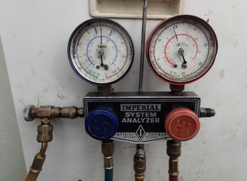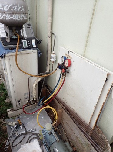 再び現場に戻り、真空引きとフロンガス充填です。