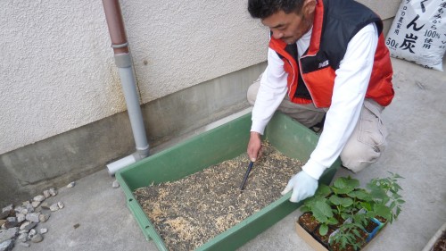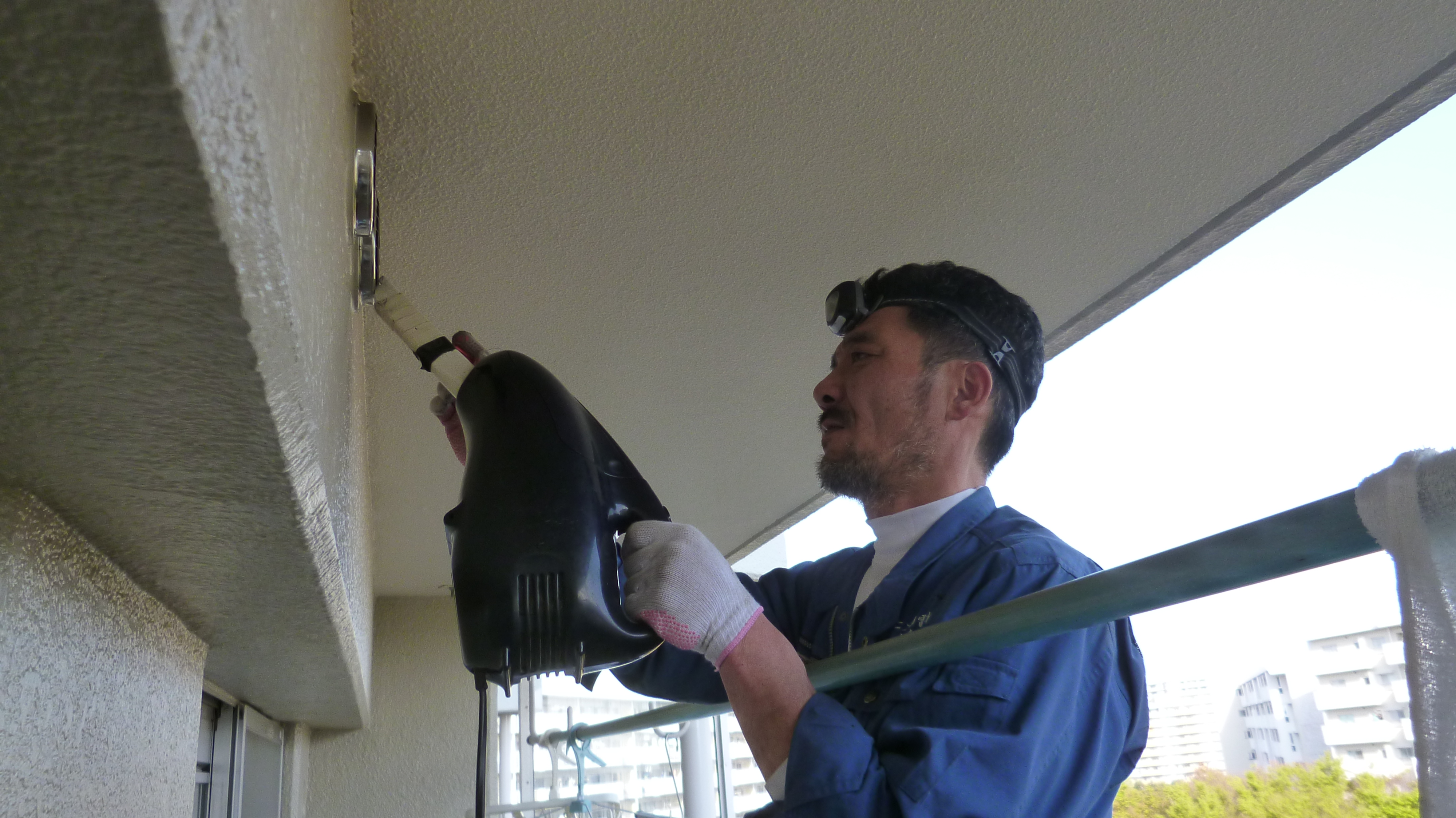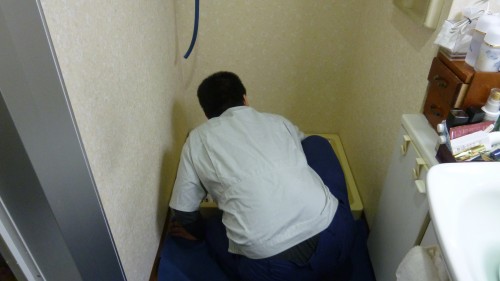 コンクリートの粉で 御得意様のお住まいを汚さない様に ちりとりで切粉を受け取ります。