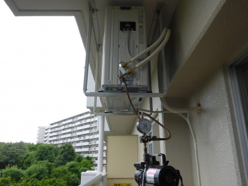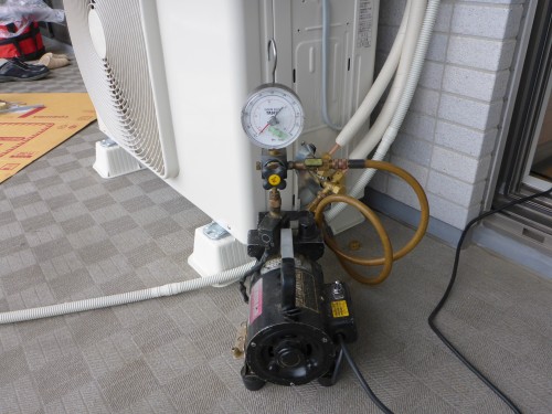 はい、ばっちし室外機天吊りの完成と、真空引き&機密試験です