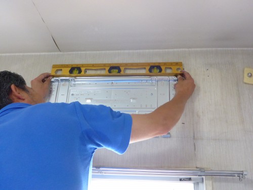 新エアコンの背板の取り付けです、水平器を使用してしっかりと水平に取り付けをさせていただきます