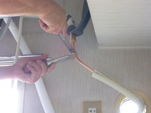 トルクレンチを使用して、フロンガス漏れの無い様にしっかりとした締め付けです