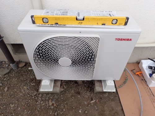 既設のブロックと、新エアコンの足がぴったりしません、少し傾きもあります