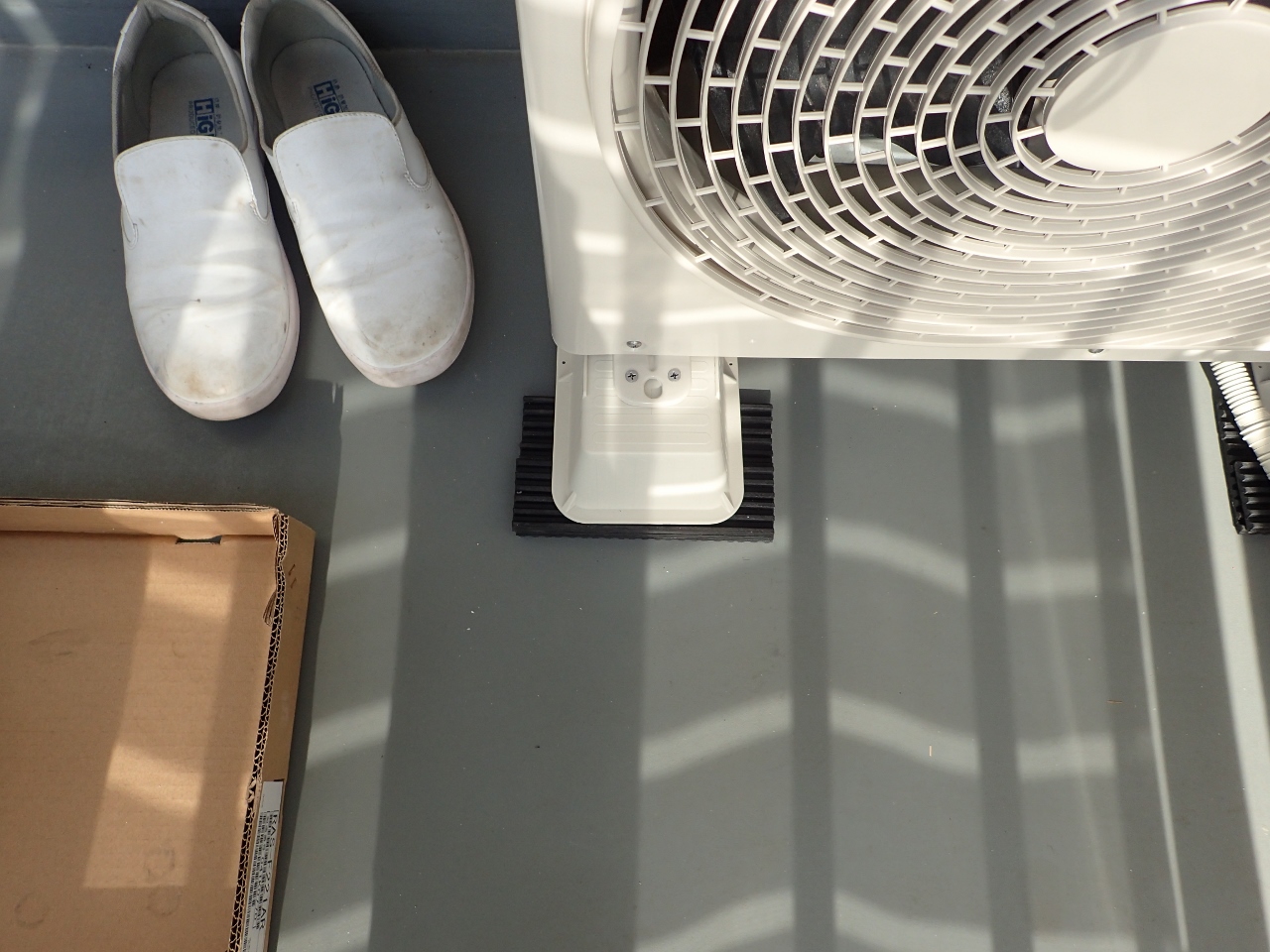ベランダの水切り勾配で、室外機が傾かない様に、防振ゴムで調整