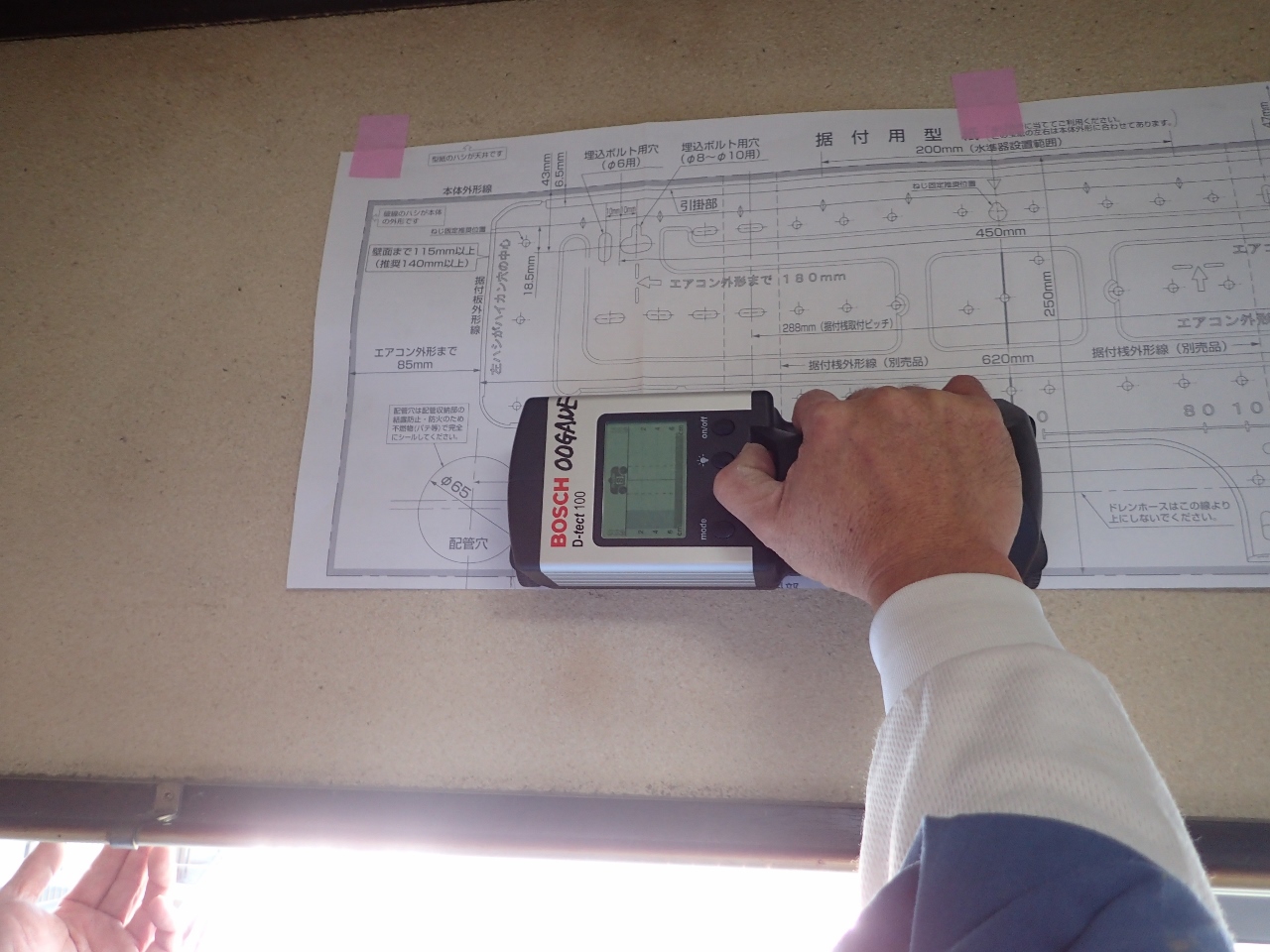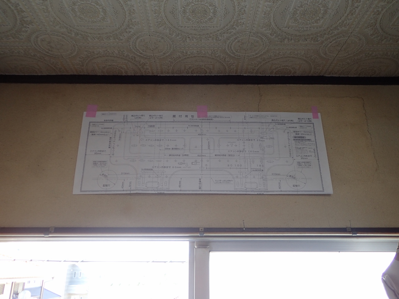 先ずは、エアコンの下紙をあてがって、S様と取付位置のご相談を致します。