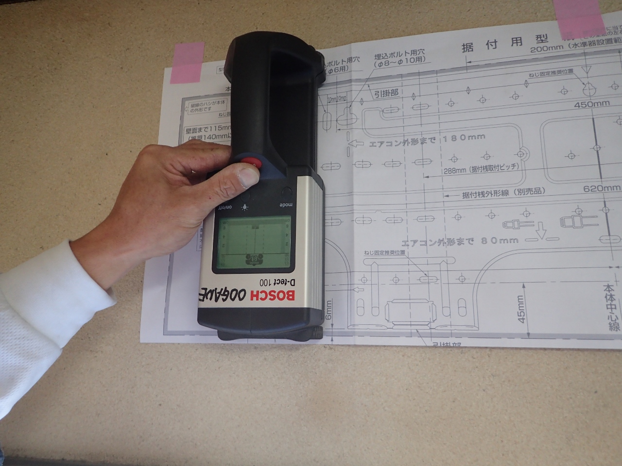 僕流ですが、壁の厚みを探る為に、下穴をあけます。