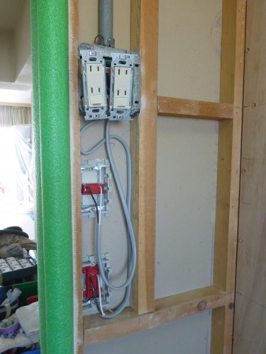 カップボードの上側にも、電子レンジ専用のアース付きコンセントも増設させていただきました。