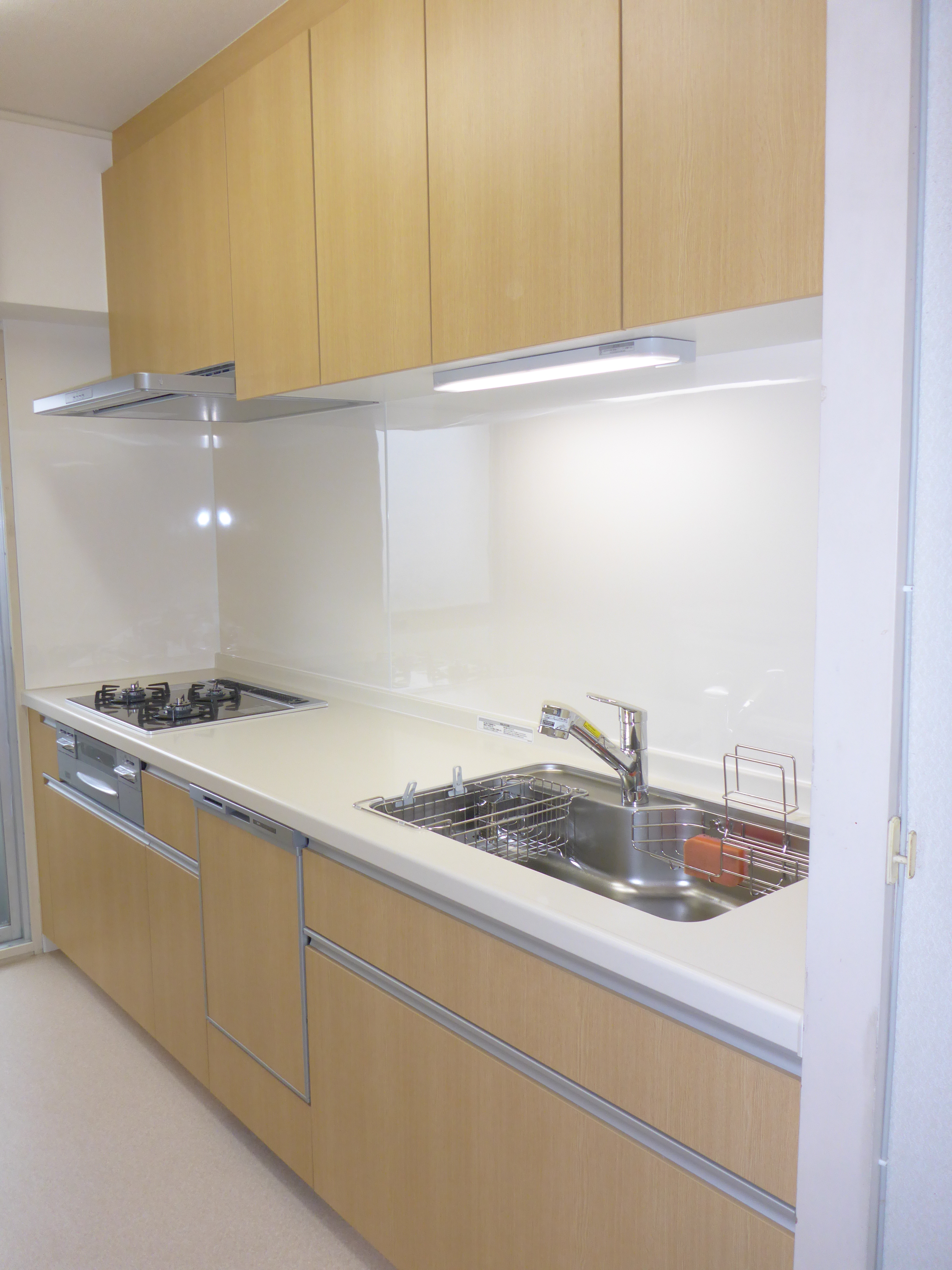正面壁は、バニラ色のキッチンパネルを使用して、鏡の様に光ってます。