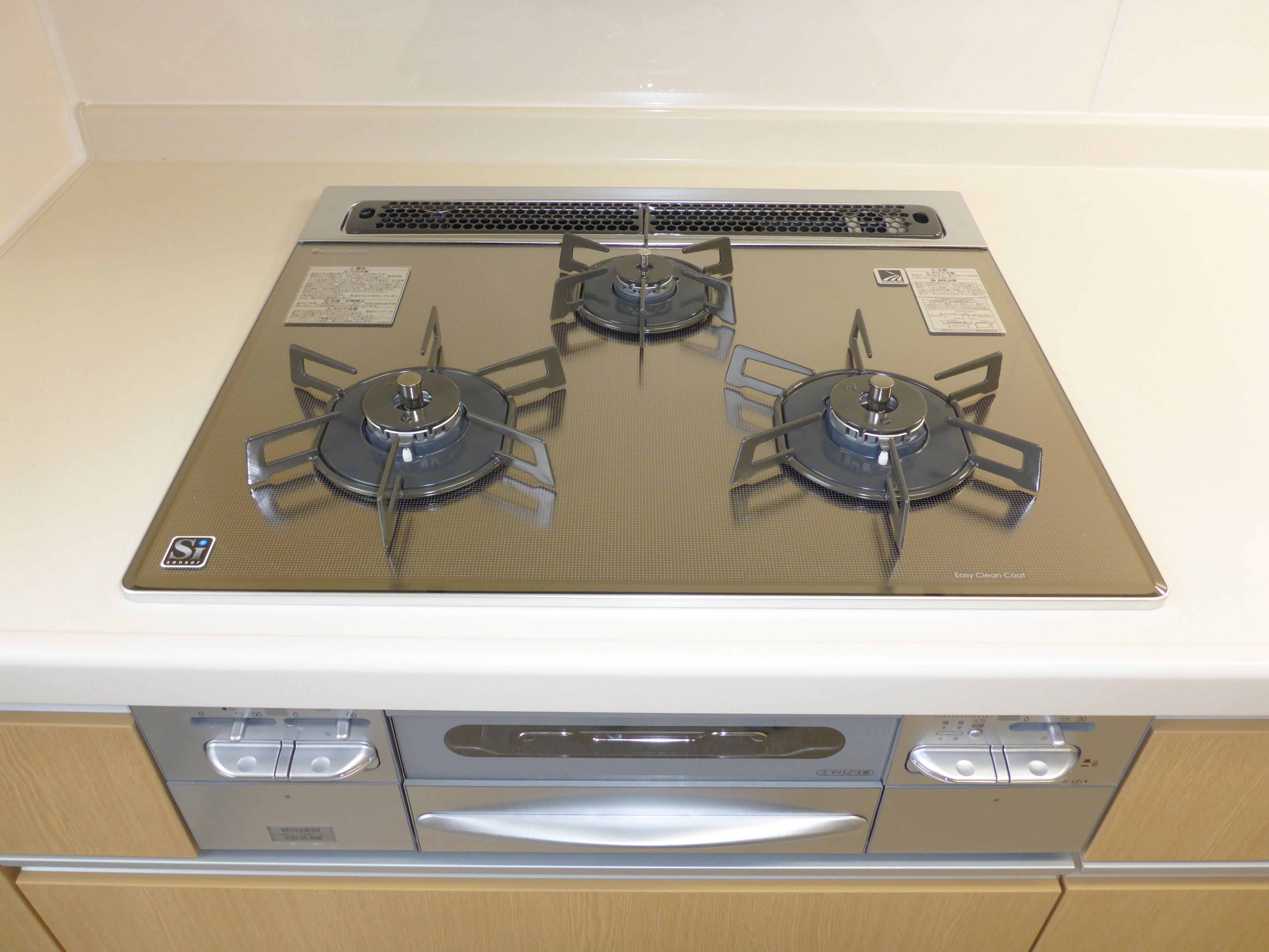 熱源は、ガラストップの3口コンロと両面焼きグリルです