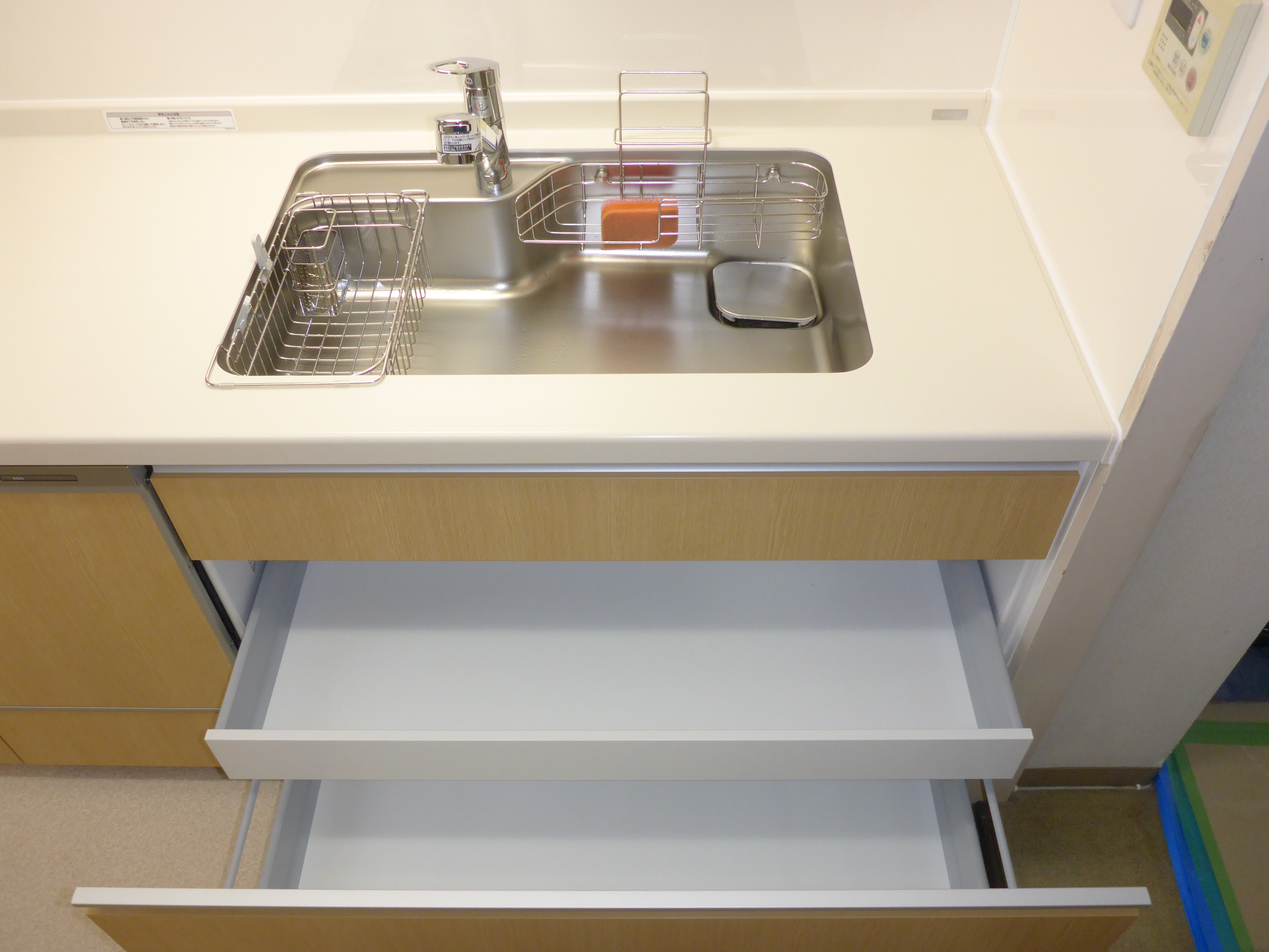 シンクは、TOTOお勧めのすべりだいシンクです、シンク下の収納も広々です。
