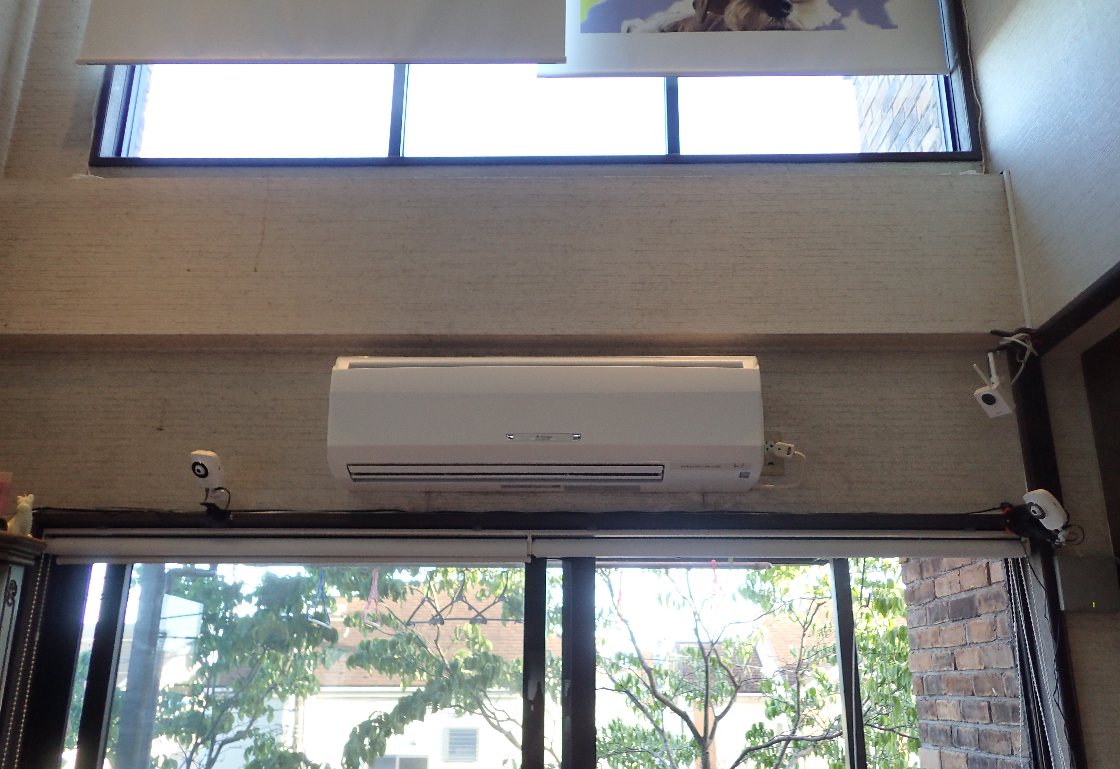 室内機を少し下げ気味取り付けにして、吸い込みが良く、冷気の循環が良い取り付けに