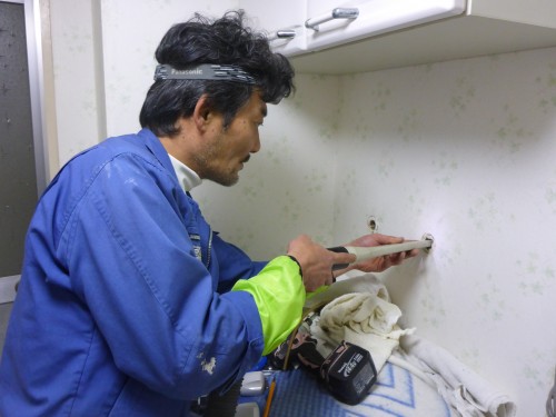 大きい水平器を使用して、乾燥機用の壁掛け金具の設置工事です。