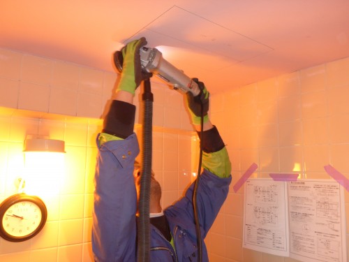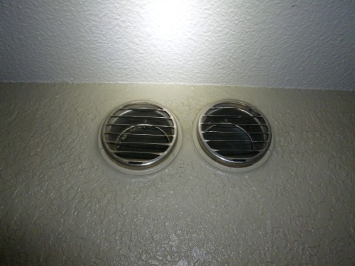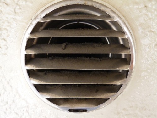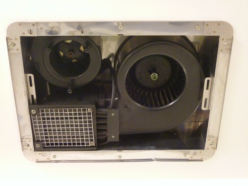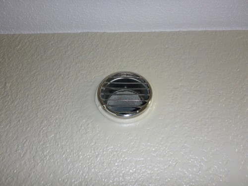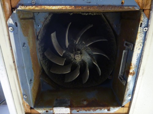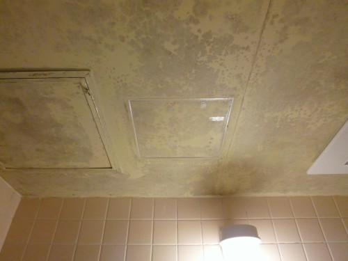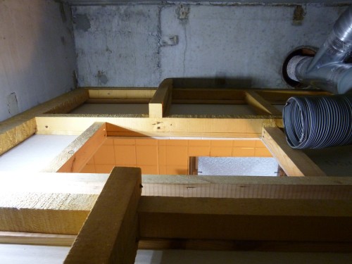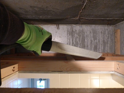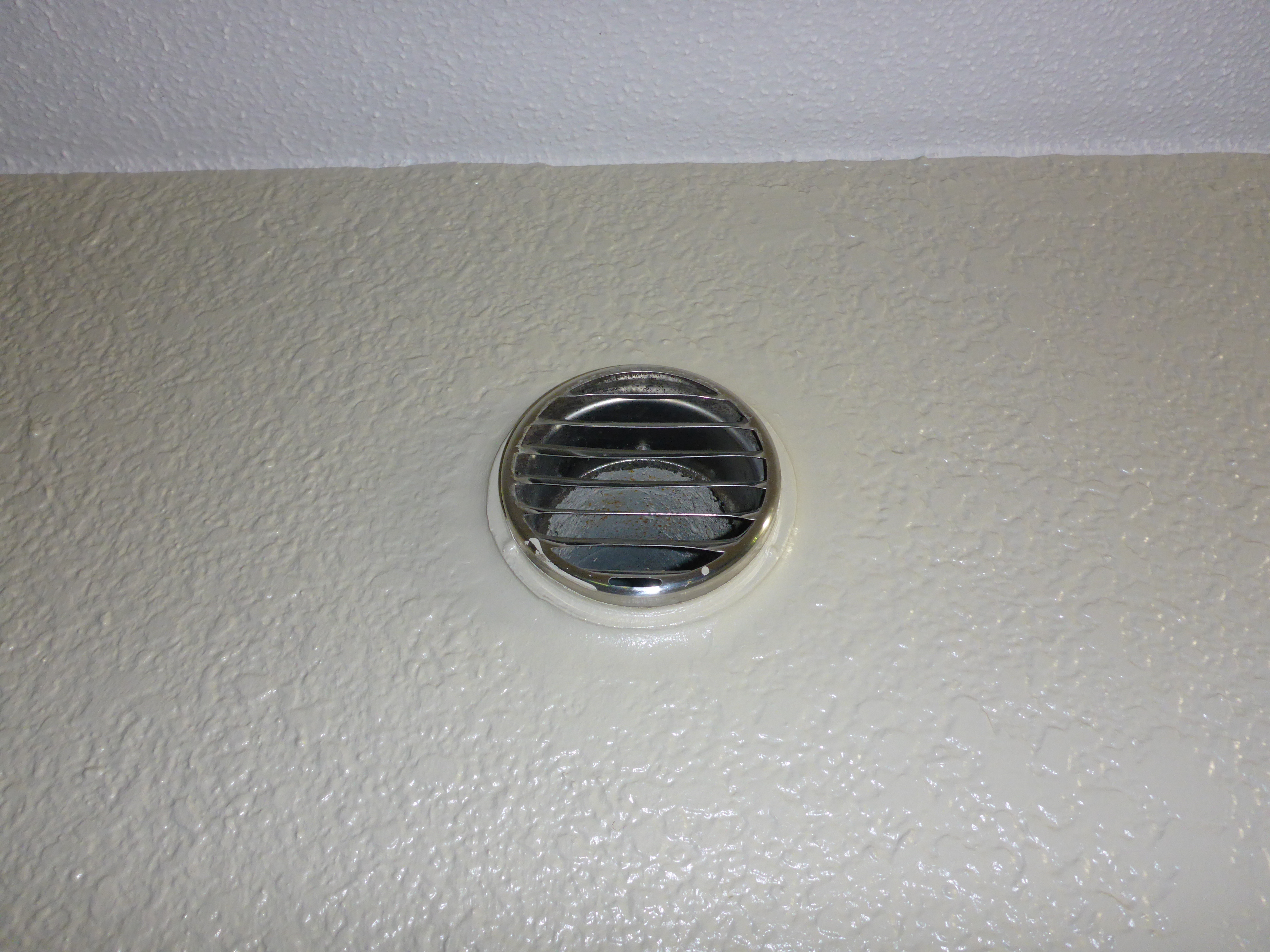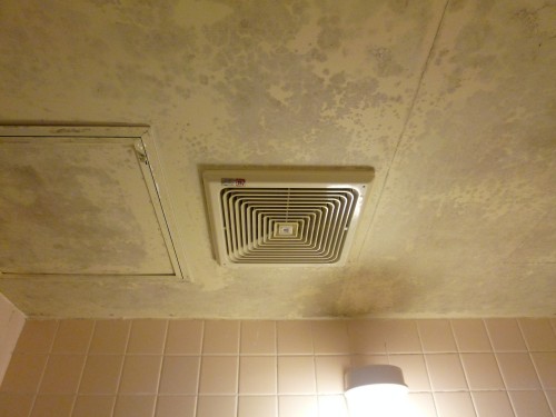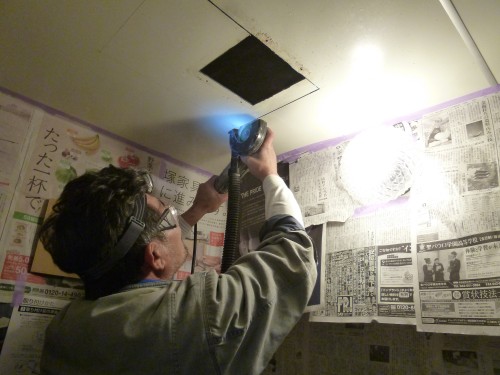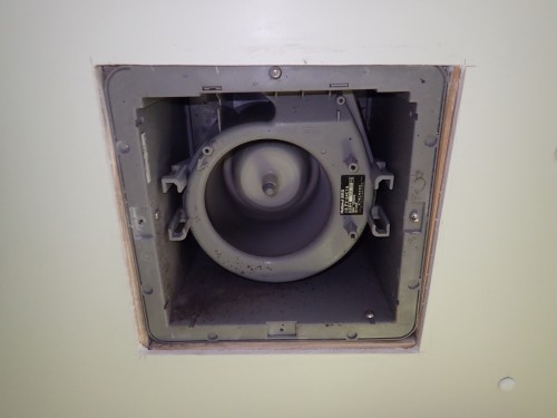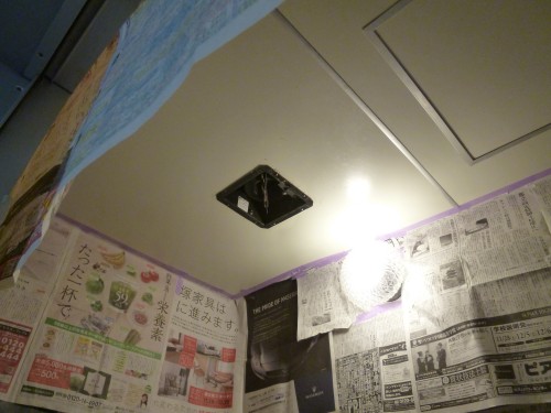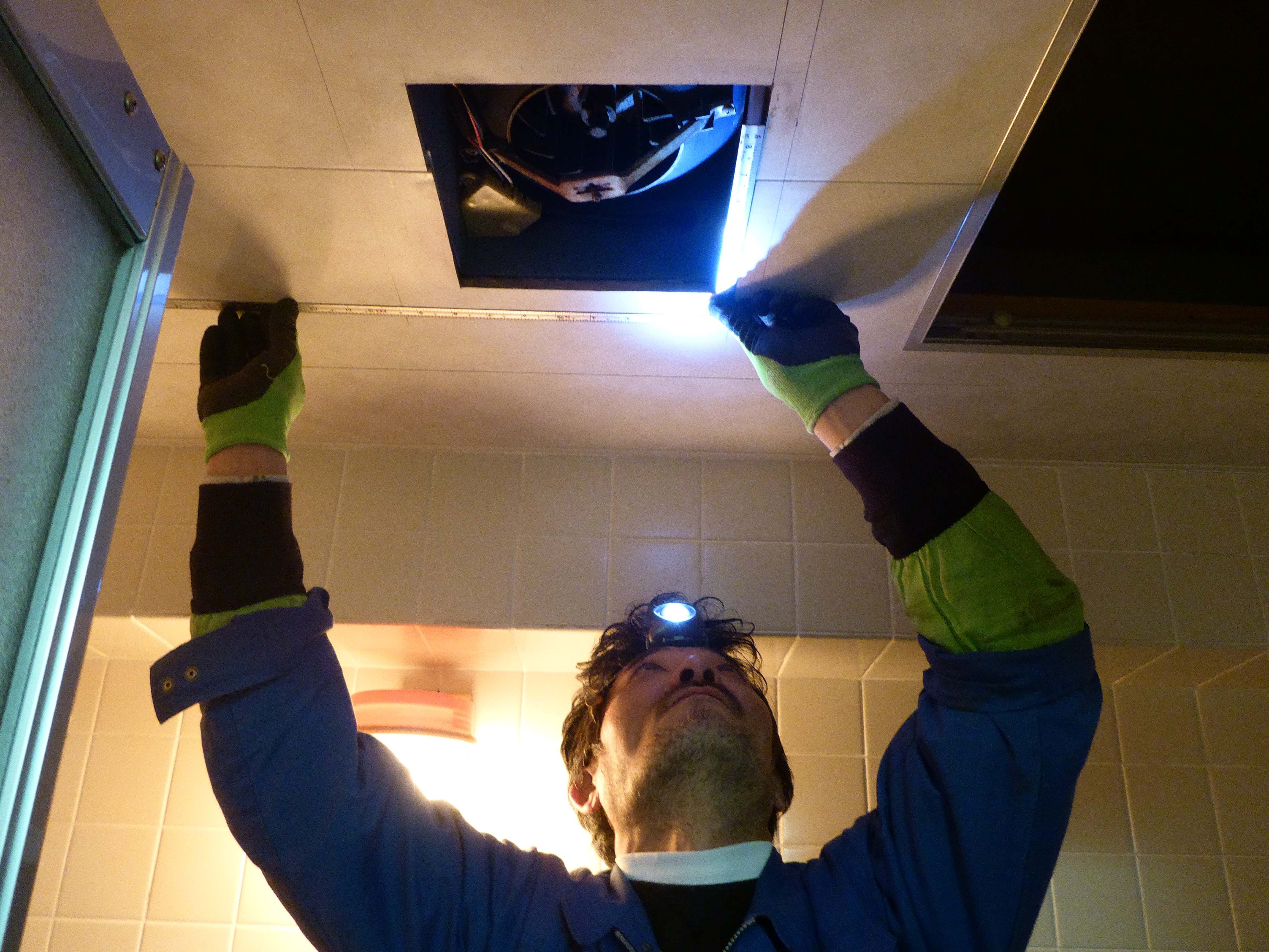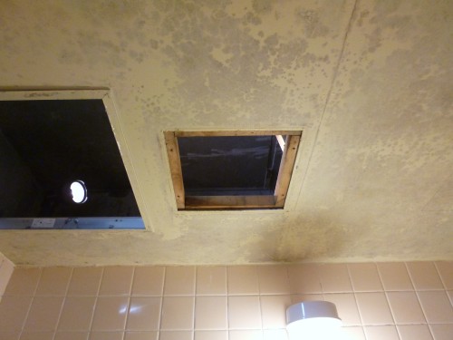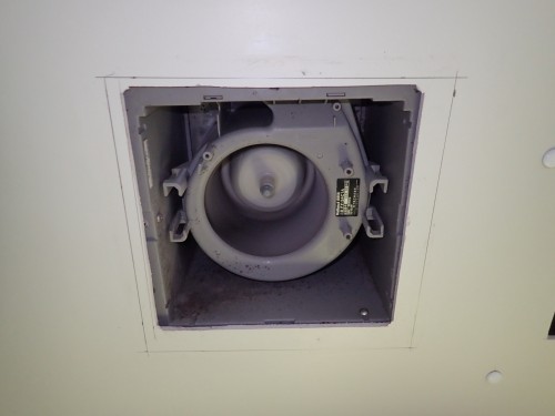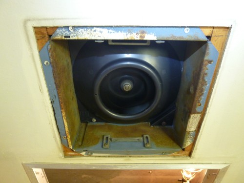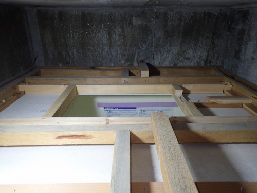 天井裏の骨組みと換気扇と天井材がサンドイッチに成っていて