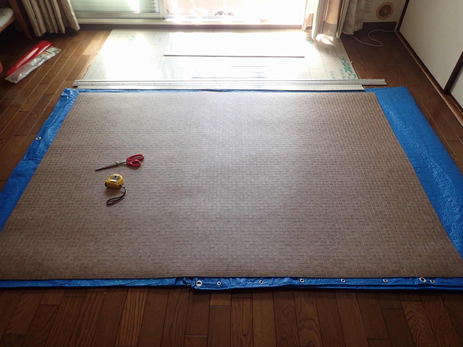 先ずはリビングをお借りして、床材の巻き癖を取ります。
