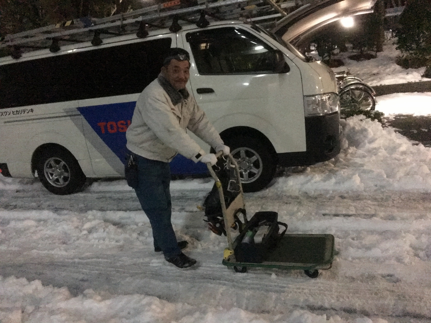 雪かきで少し疲れ気味の ㈱ヒカリ電機 店長兼作業員の大金より
