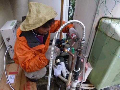 ようやく水抜きも終わり、次の工程はお湯配管にメスアダの半田付けです