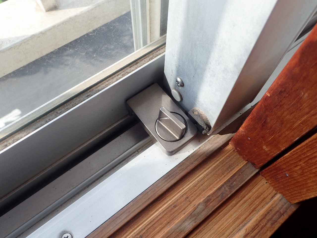 サッシの左上のプラスチック留め具が、新ウインドエアコンの窓枠と