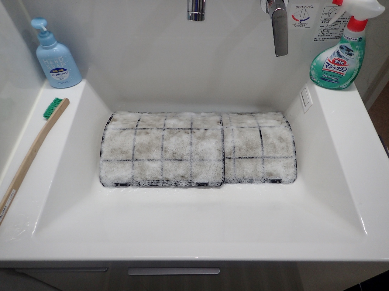 洗面台をお借りして、フィルターを洗って。