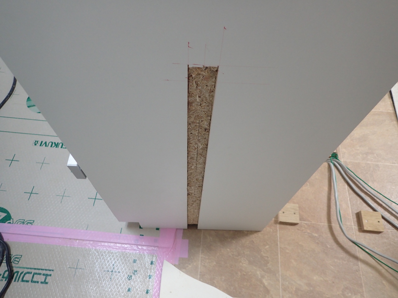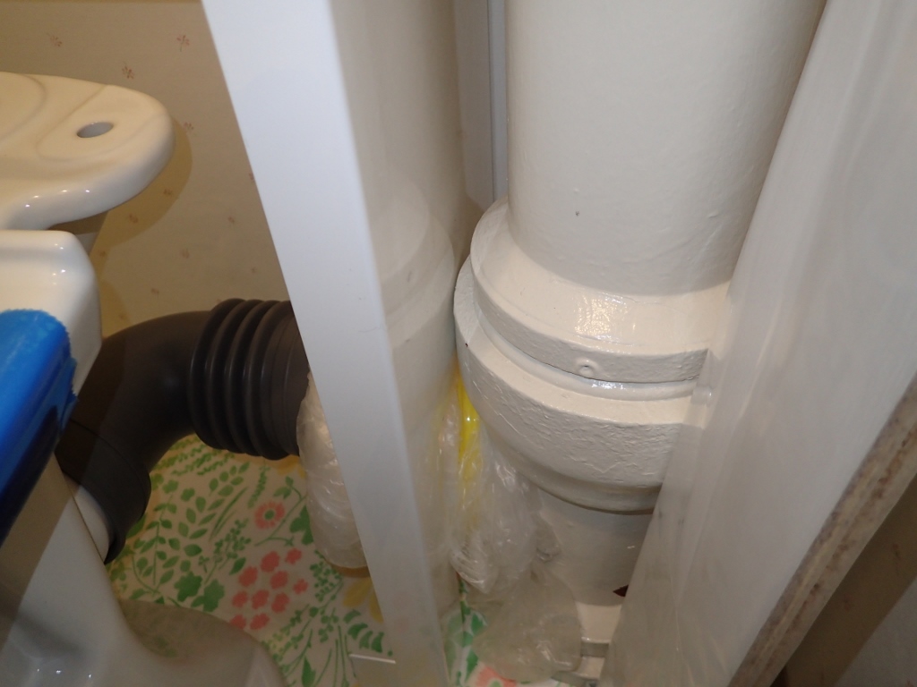 室内立管の出っ張りで、メインキャビが5ミリ程壁から浮いてしまいます