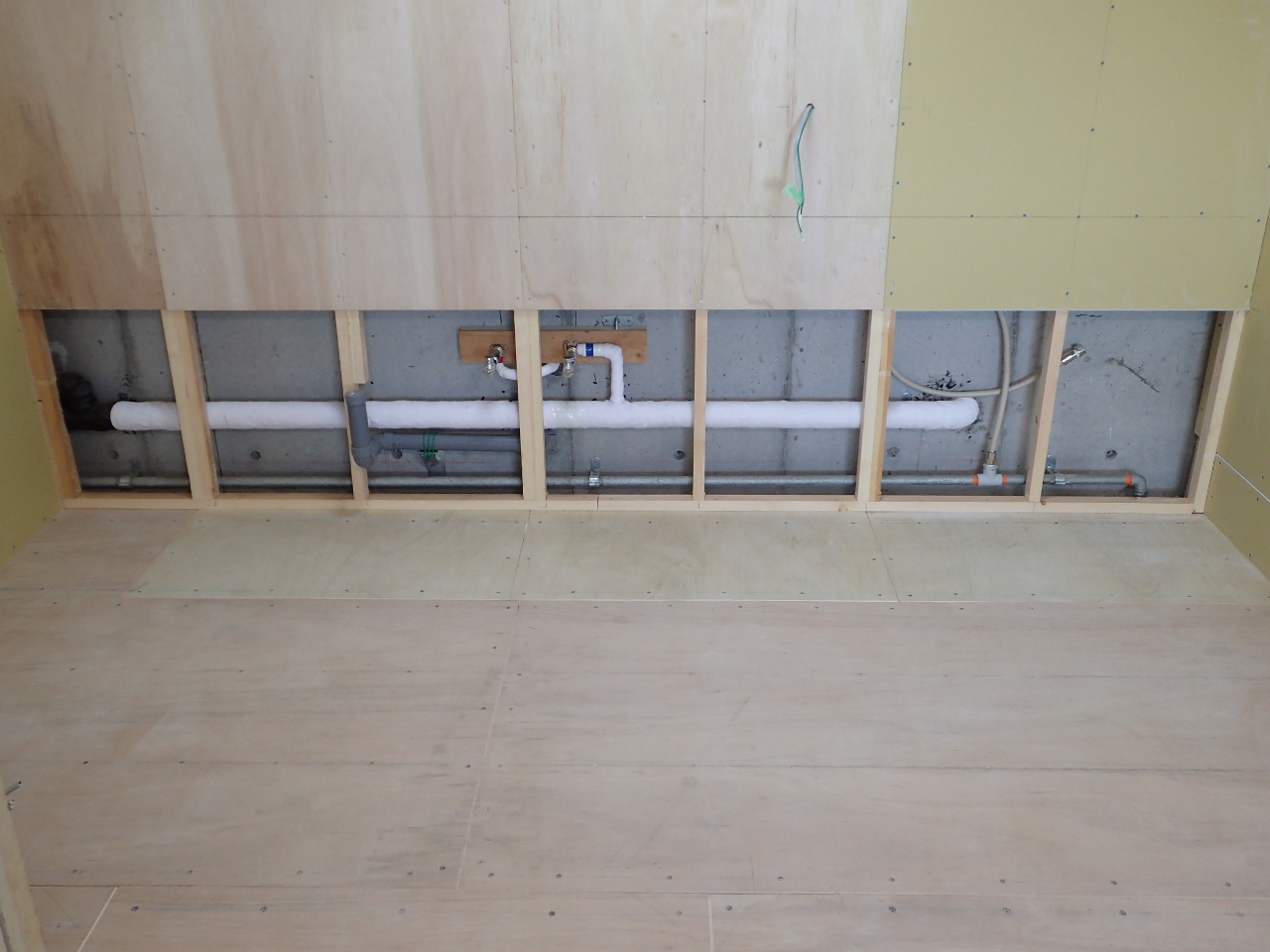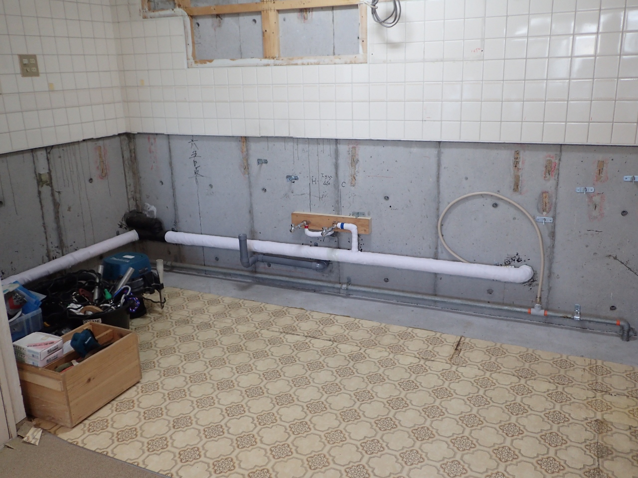 中盤の作業先ずは、新キッチンに合わせて給水、給湯、排水管の位置変更です