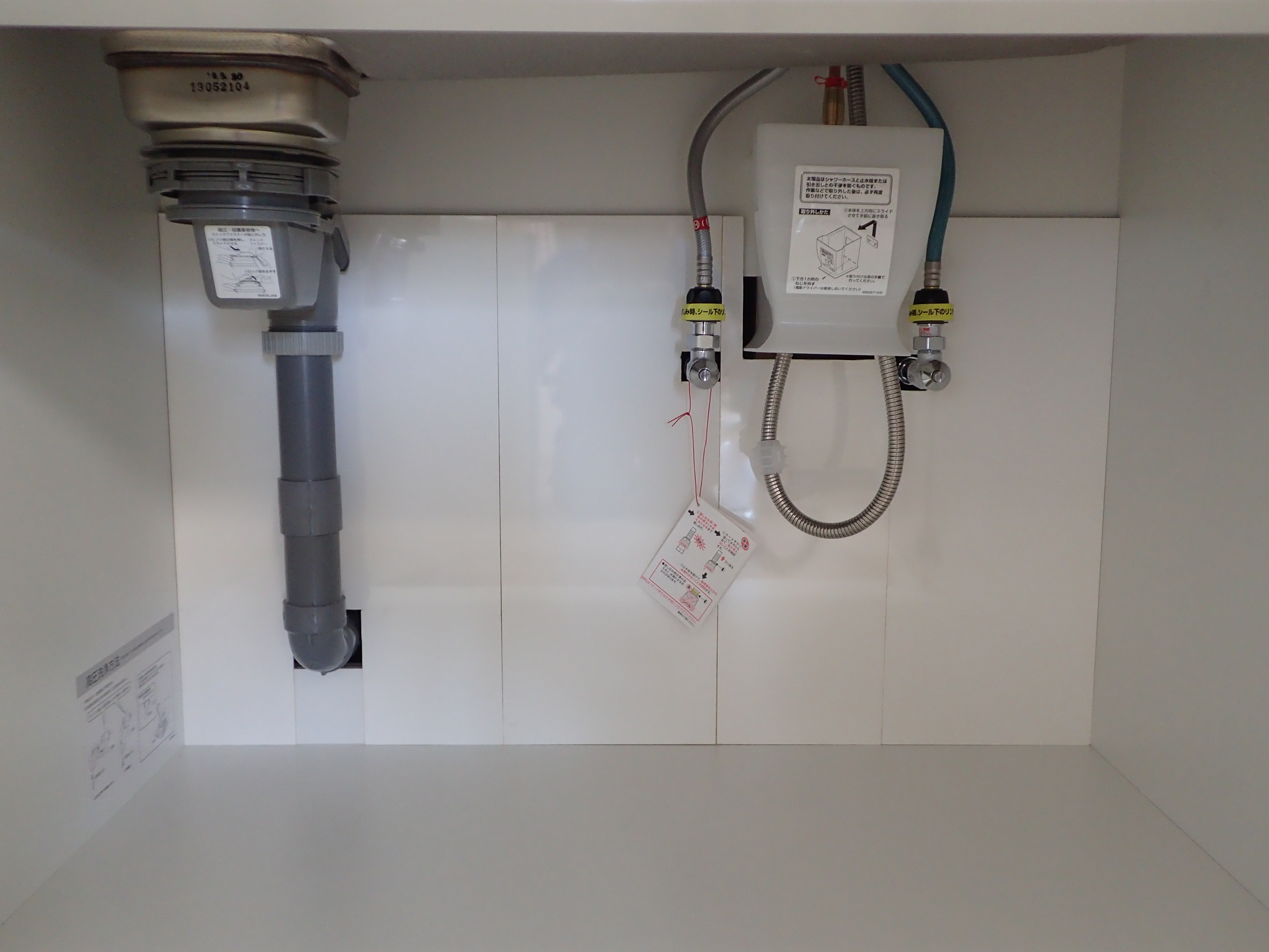 これで、万が一の時はお化粧カバーを外せば、給水、給湯。排水の点検が出来ます。