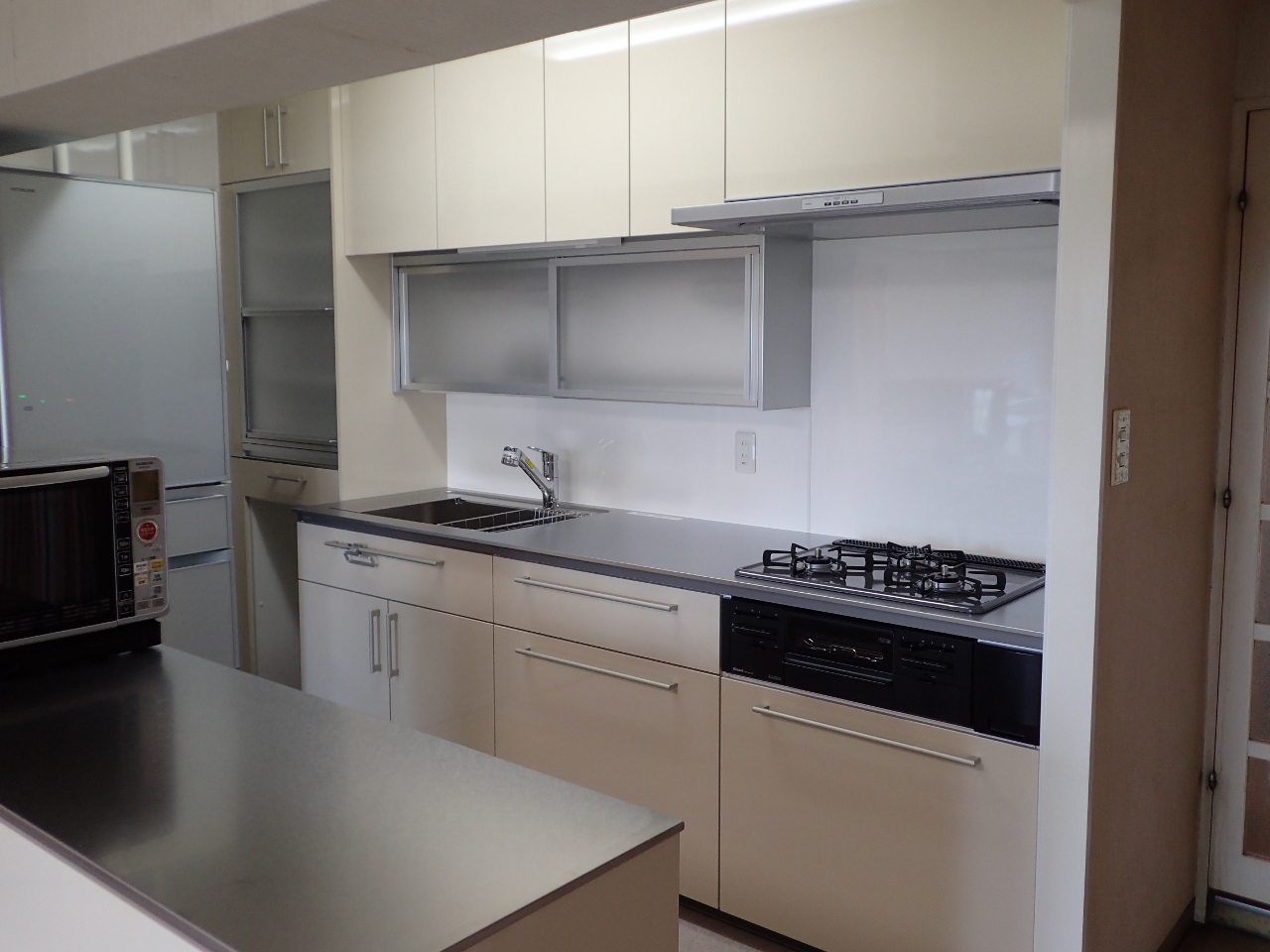 冷蔵庫も定位置に収まりまして、電子レンジもアイランド収納の上に収まりまして、なによりでした。