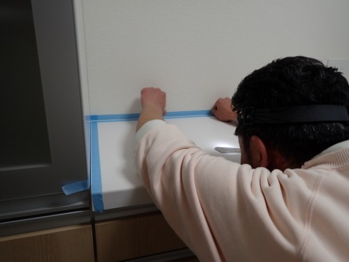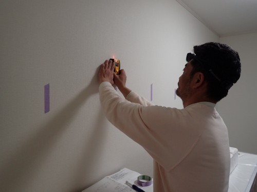 収納をしっかり固定する為に、壁裏センサーを使用して