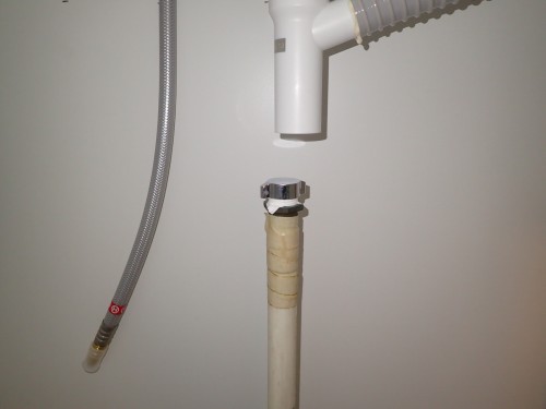 新洗面台の排水管と、既設のお湯管がぶつかって