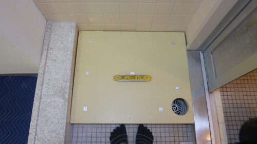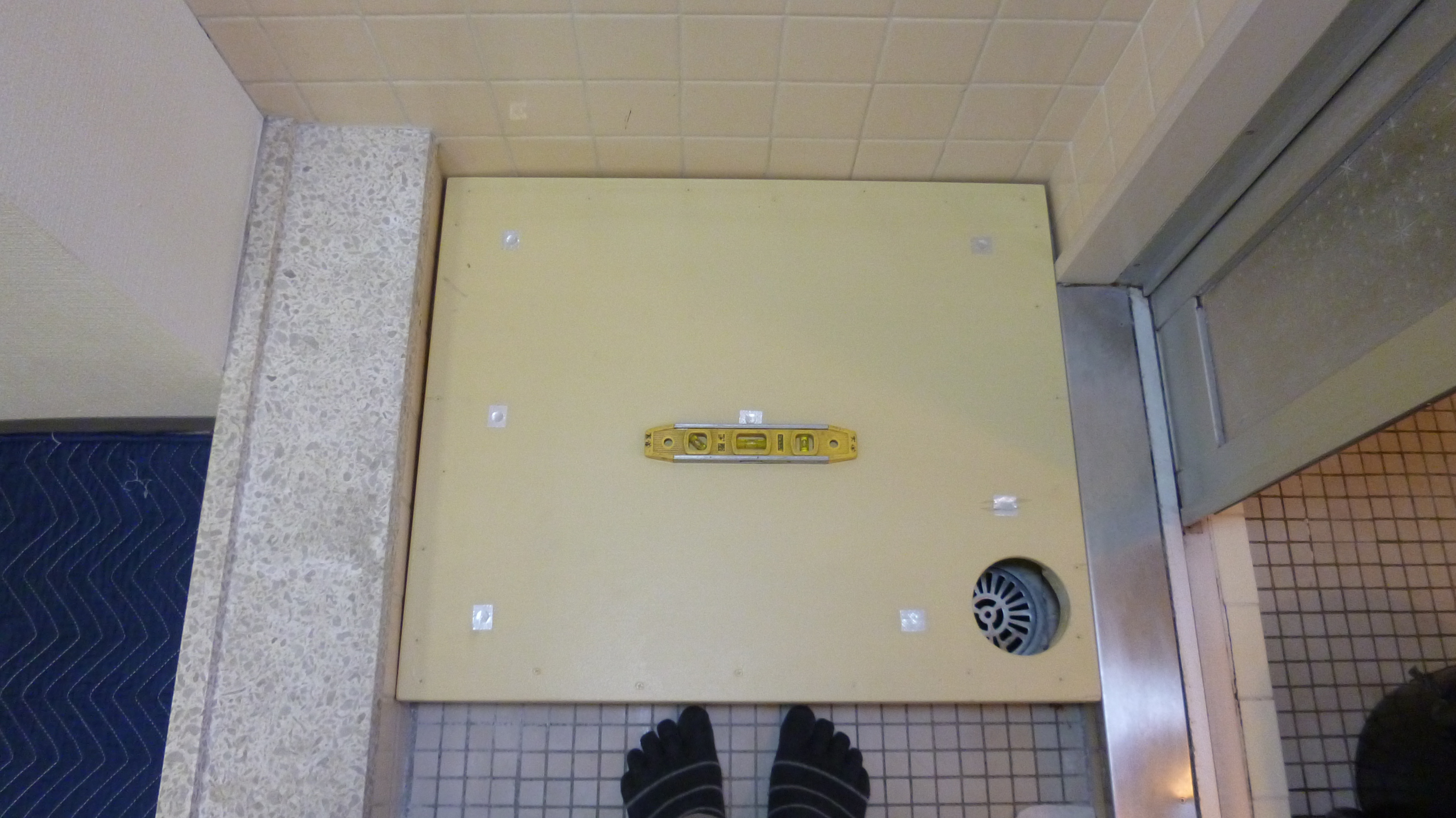 N様宅の洗濯機置き場は水切の為、排水口側へ2センチほど傾斜しております。