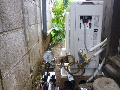 いつも通り真空引きも終わり、最終の室外機のアース工事です。