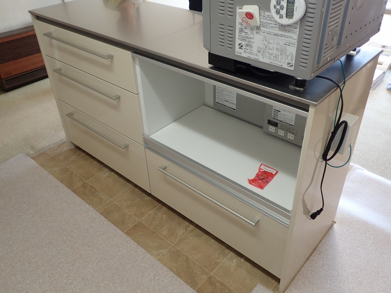 冷蔵庫も定位置に収まりまして、電子レンジもアイランド収納の上に収まりまして、なによりでした。