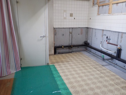 中盤の作業先ずは、新キッチンに合わせて給水、給湯、排水管の位置変更です