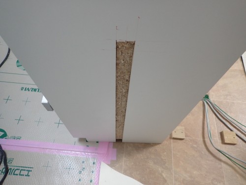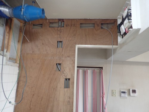 縦のマスキングテープの部分に、下地木桟の間柱が入っていました。