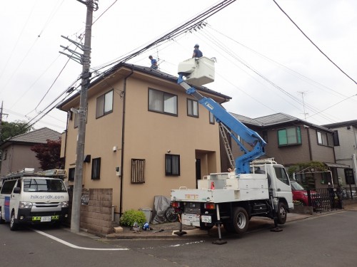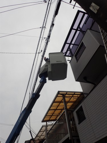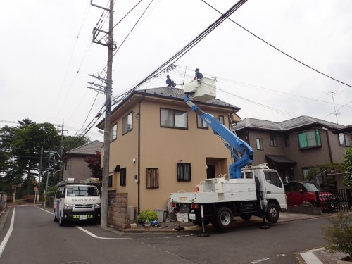 M様宅の旧アンテナに向けて、高所作業車を寄せて行きます。