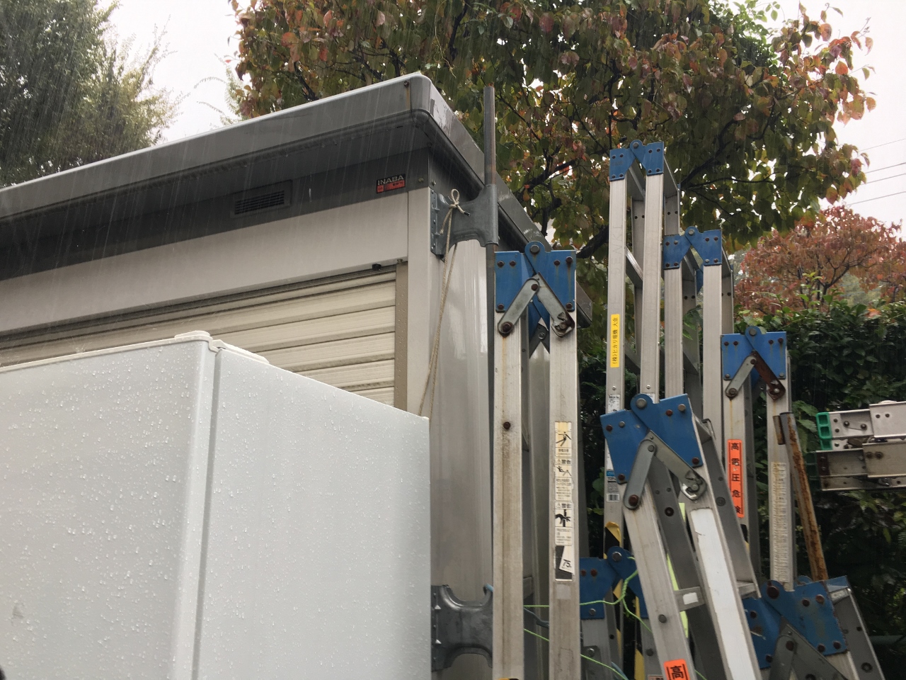 安全の為、ダブルではしごをかけまして。