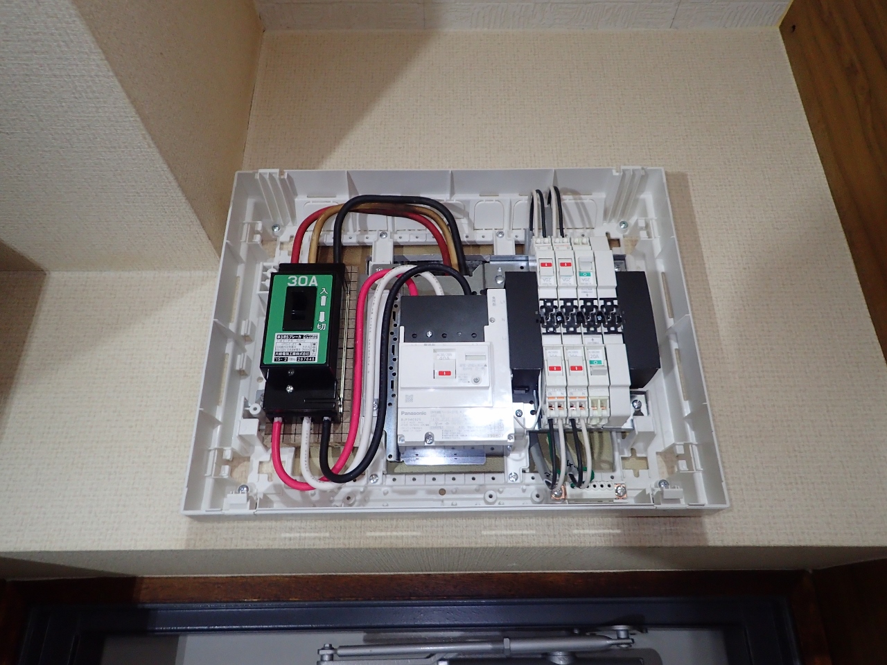 最新の漏電遮断機付きの分電盤に取替工事の施工事例を紹介いたします。