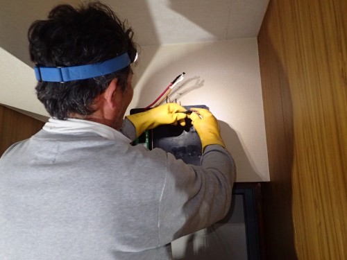 次の工程は、電気手袋をして、旧分電盤を取りはずして行きます。