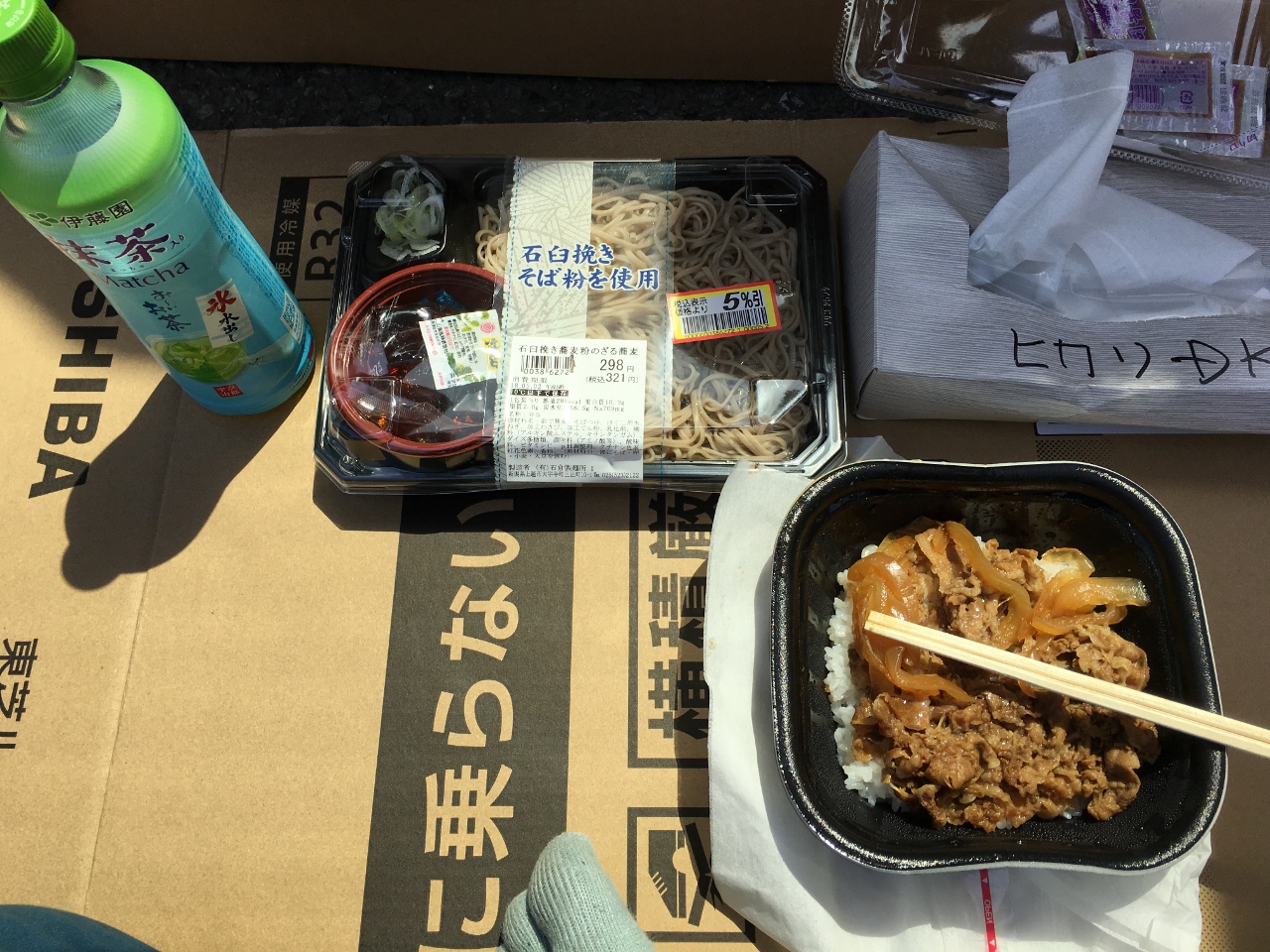 スーパーで買って来た、牛丼とお蕎麦を食べて充電タイムです