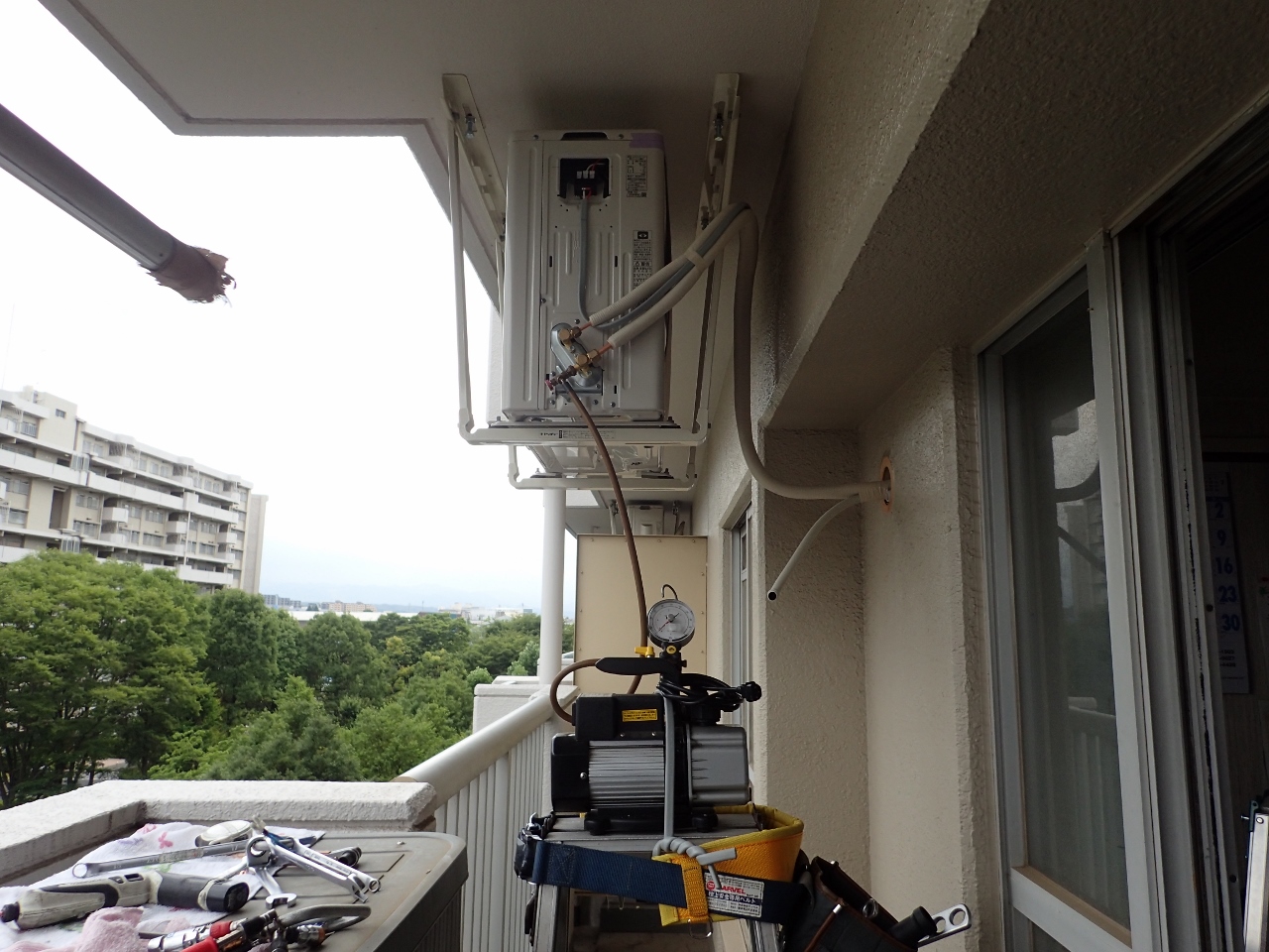 S様へ、室外機のマンション吊り工事、いつも通りに真空乾燥と機密試験をしっかりさせていただきました。
