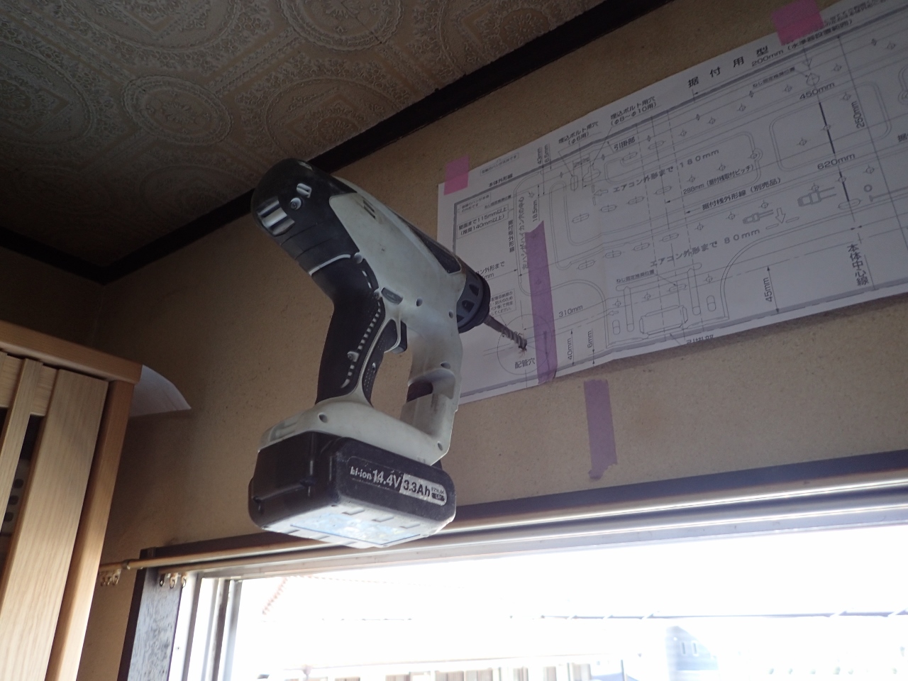 先ずは、エアコンの下紙をあてがって、S様と取付位置のご相談を致します。