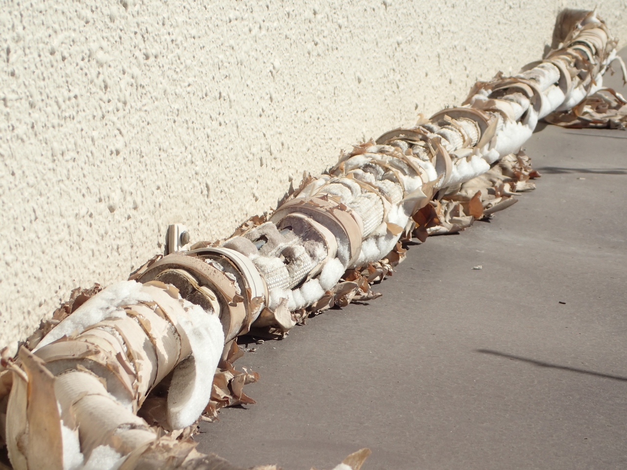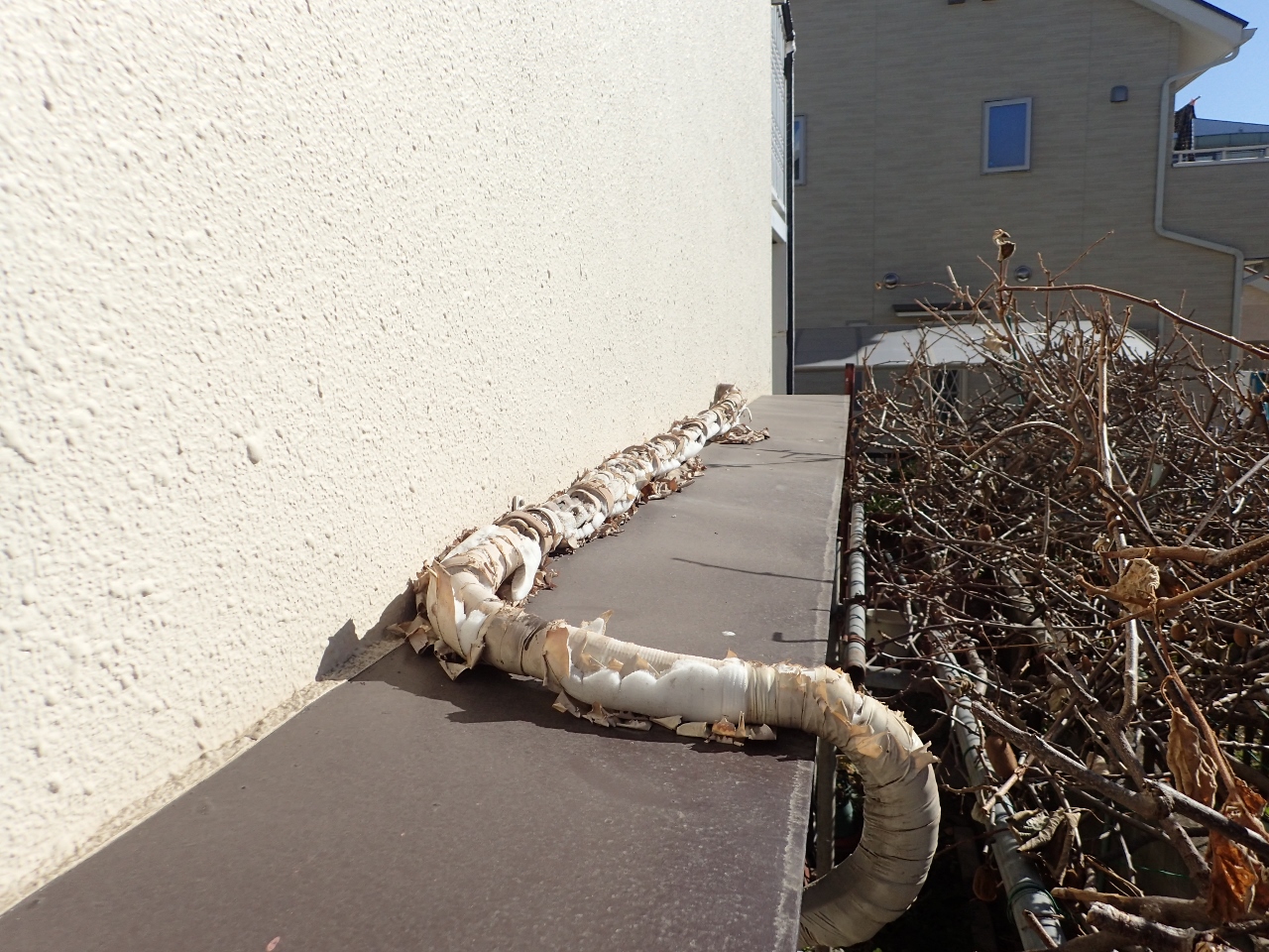 能力低下の原因は、こちらの↑配管の保温チューブが、日差しと雨で