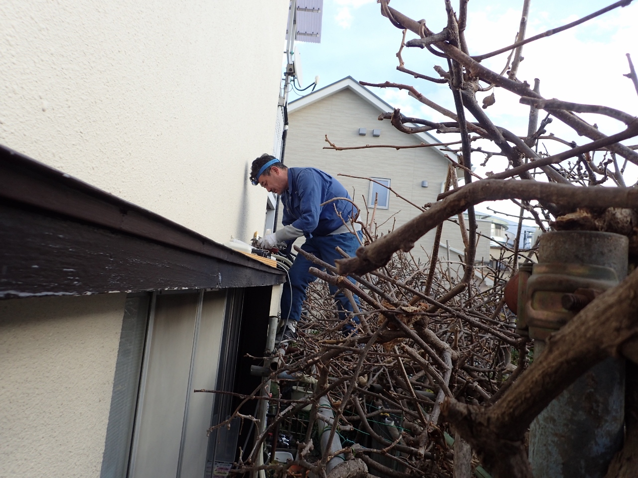 続いて、室外の配管化粧カバー工事です
