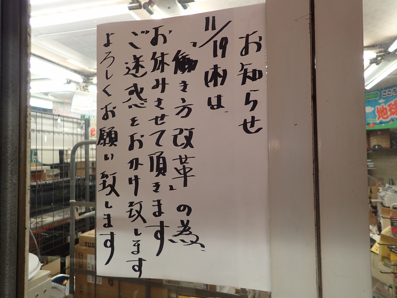 今日のお知らせは、2020/11/19(木曜日)はスタッフの働き方改革の為、お休みを頂きました。