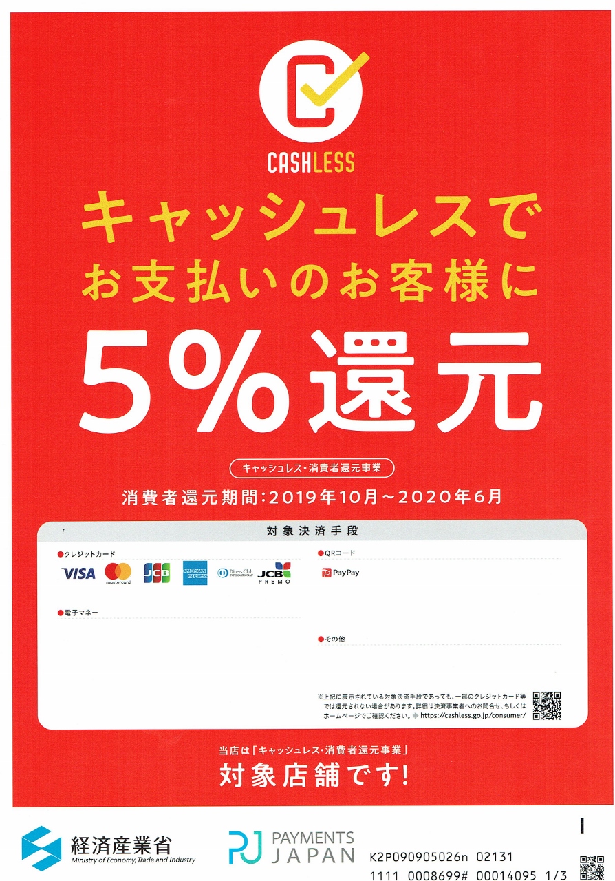遅ればせながらキャッシュレス決済と、キャッシュレス、ポイント還元事業に対応しました。
