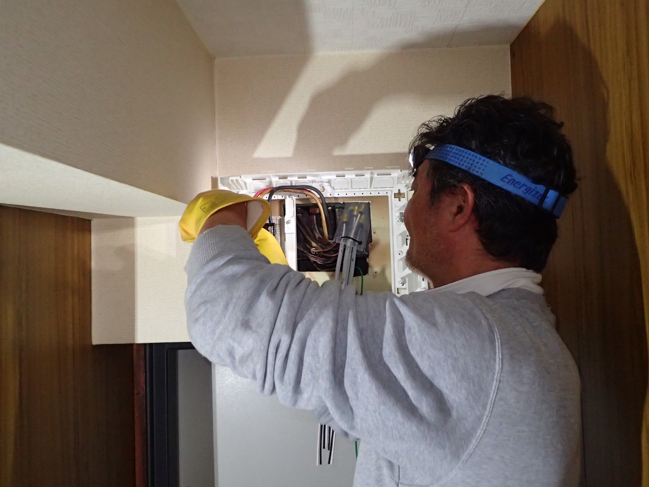 次の工程は、電気手袋をして、旧分電盤を取りはずして行きます。